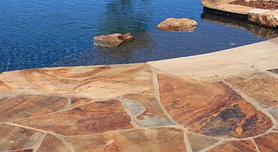 Flagstone pavers are available mostly in earthy colors and textures and its slip free surface along with its resistance to moisture and heat make it a durable option for pool decks. Because of its high density, flagstone is very low maintenance and extremely durable.